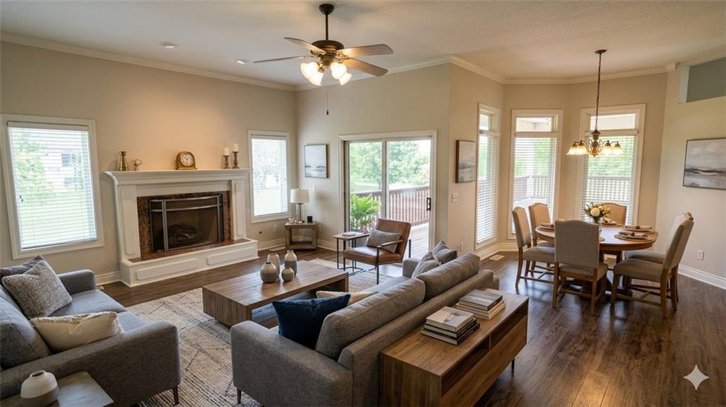 Highly desirable Lake at Twelve Oaks. Offering nearly 4,200 +/- square feet of finished living space, this reverse ranch is tucked at the end of a quiet cul-de-sac on a private .95-acre lot. Designed for both everyday living and entertaining, the main level features a bright living room, a comfortable family room with fireplace, and versatile dining options including a formal dining area, breakfast nook, and a granite wraparound bar with seating for six. A convenient laundry room adds efficiency, while three sets of sliding doors open to an expansive 450 sq ft covered deck for seamless indoor-outdoor living. The walkout lower level is ideal for gatherings or multigenerational living, offering a large recreation area with a second fireplace, a full second kitchen, and a spacious bedroom with nearby bath. Outdoor living continues with direct access to a covered patio, expansive bar area, hot tub, and a large L-shaped in-ground pool—creating a private retreat for entertaining or relaxing. Located in Lake at Twelve Oaks, residents enjoy lake access, scenic walking trails, and a strong sense of community with annual events such as a 4th of July fireworks extravaganza. Conveniently situated just minutes from Altec, Missouri Western State University, Herzog, and Mosaic Hospital. Nearby schools include Oak Grove Elementary and St. Joseph Christian School, both just minutes away.