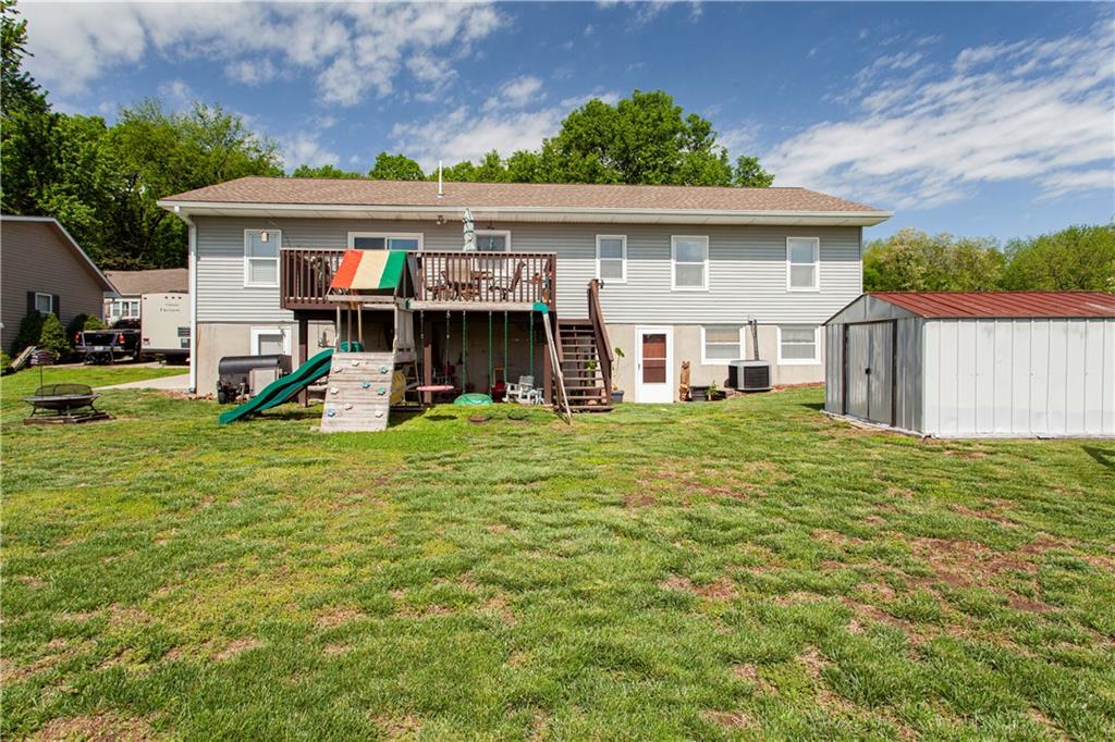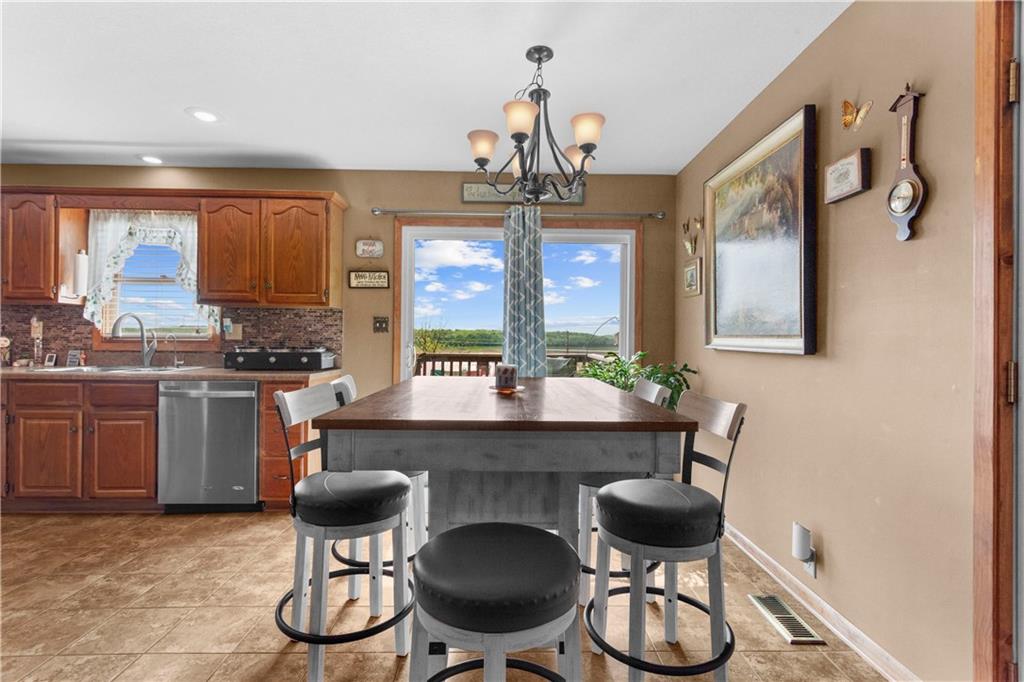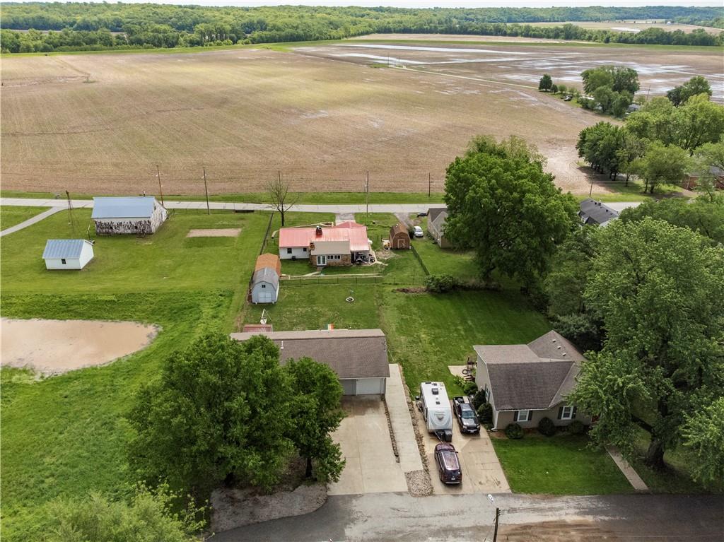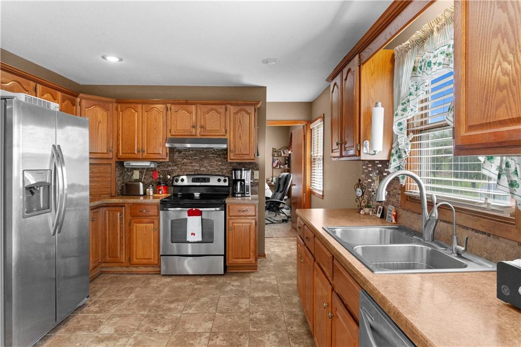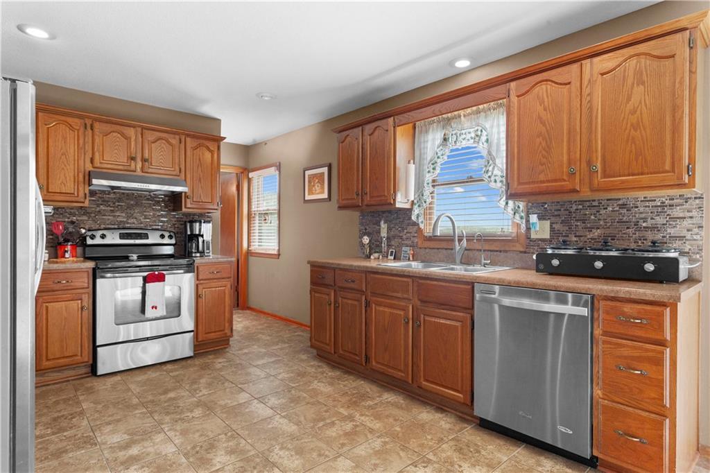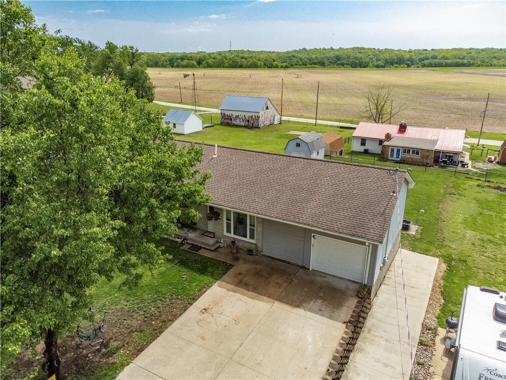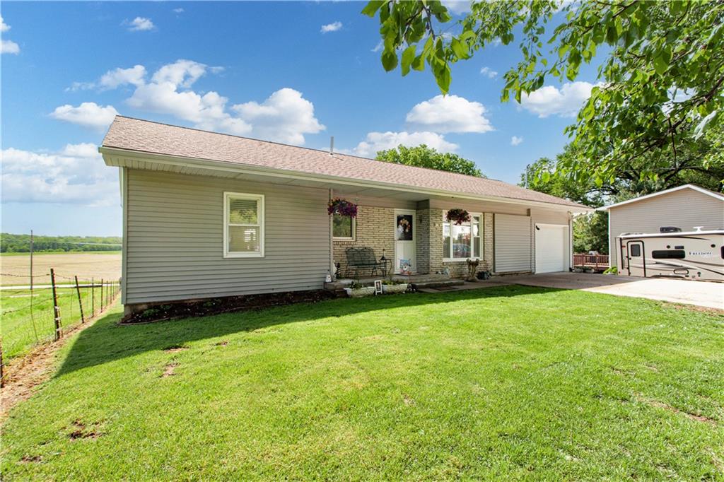 Enjoy the perfect balance of peaceful country living with the convenience of a short commute to the city in this move-in ready true ranch, offering generous space and thoughtful updates throughout. The spacious kitchen is ideal for everyday dining and entertaining, flowing seamlessly into a large, inviting living room. The main level features three bedrooms and a beautifully renovated bathroom, along with stainless steel appliances that remain with the home. The finished basement expands your living space with a sizable family room, a fourth non-conforming bedroom, and a second fully remodeled bathroom. You’ll also find a newly installed kitchenette—complete with a second refrigerator that stays—making it perfect for guests, multi-generational living, or additional convenience. There’s ample room for a craft area, workout space, and a laundry room with excellent storage options. A water softener is also installed and will remain with the home. From the rear exterior of the home, you’ll find a fully enclosed concrete safe room with all four walls constructed of cement—ideal for use as a storm shelter, workshop, or additional storage space. Spectrum Fiber has been installed and the hub is located in the garage. Step outside to a recently refinished deck, perfect for morning coffee or evening relaxation, overlooking a spacious backyard with two sheds and peaceful farmland views beyond. The home’s exterior features low-maintenance vinyl siding and brick, and all sewer lines were replaced in October 2020 for added peace of mind. The play-set in the back can stay! Located in the West Platte R-II School District, this property offers easy access to KCI Airport, the Legends shopping area, Zona Rosa, Weston, and Platte City, Leavenworth and Lansing. Situated on a quiet dead-end street, this charming home is one you won’t want to miss.