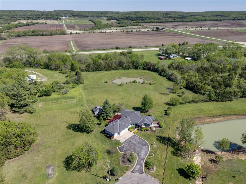 Enjoy peaceful country living just south of Lawrence on 5 scenic acres! This custom-built home showcases beautiful woodwork and quality craftsmanship throughout. The spacious, open main level is filled with natural light from large windows that capture stunning views in every direction. Relax and unwind in the inviting three-season porch, perfect for enjoying the outdoors year-round. The walkout basement features a large family room—ideal for entertaining or gathering—along with plenty of unfinished storage space for all your needs. Outside, you’ll find a pond, wide open space to roam, and a large tool shed for hobbies, equipment, or extra storage. A fantastic opportunity to own a cared for home with room to breathe, just minutes from town!