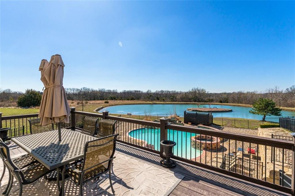 Welcome to 2343 N 600 Road, Edgerton, KS, 26.64-acre private estate blending luxury, privacy, and natural beauty. Behind the gated entrance, a tree-lined drive leads to this European Villa-inspired residence, featuring 6,491 sq ft, 5 bedrooms, 5 full and 2 half baths. The grand entryway opens to stunning interiors with soaring ceilings, arched openings, and exquisite finishes. The gourmet kitchen boasts granite countertops, custom cabinetry, double ovens, a pot filler, two wine fridges, and a butler's pantry, flowing into the hearth room with a stone fireplace, exposed beams, and a wall of windows. The formal dining room with stone flooring and a custom chandelier provides an elegant gathering space, while expansive decks and patios showcase breathtaking views of the pool, pond, and rolling landscape. The primary suite is a serene retreat with vaulted ceilings, private deck access, and a spa-like bath featuring dual vanities, a whirlpool tub, and a walk-in shower. The lower level offers a spacious rec room, stone fireplace, built-ins, and two additional ensuite bedrooms with pool access. Outdoor living is unparalleled with a heated saltwater pool and spa, a private pond with an island, and manicured grounds teeming with wildlife. The 1,200 sq ft, 4-car epoxy-floored garage is a car enthusiast's dream, while the third-floor flex space offers endless possibilities. This one-of-a-kind property provides a secluded retreat just minutes from Lawrence, Overland Park, and the KC metro. Whether you're looking for a luxury residence, vacation getaway, or your own private oasis, this estate is a must-see.