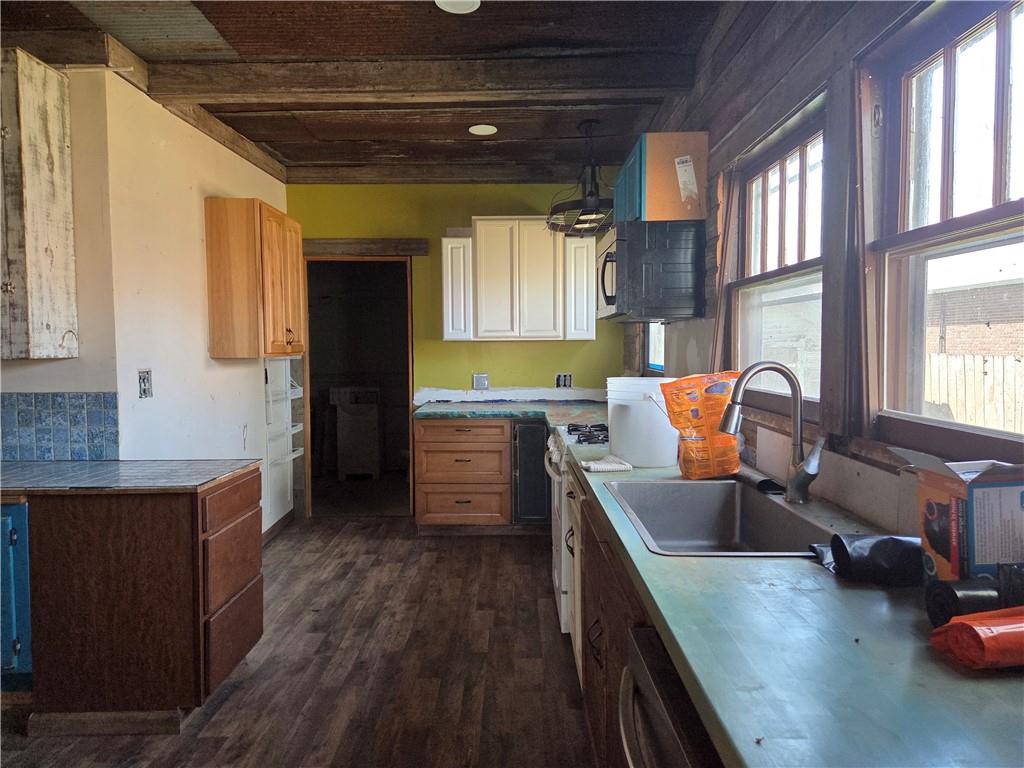 Kitchen area featuring wood-finish flooring and a wood plank ceiling