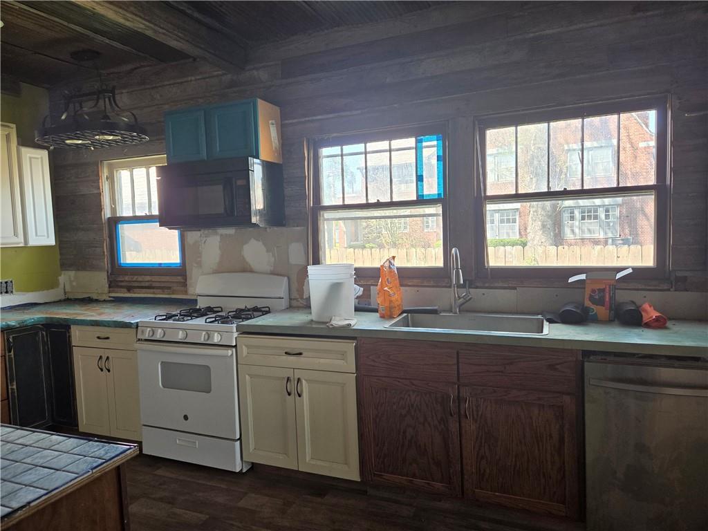 Kitchen space featuring wood-finish flooring, two large windows, a white gas range, and a stainless steel dishwasher