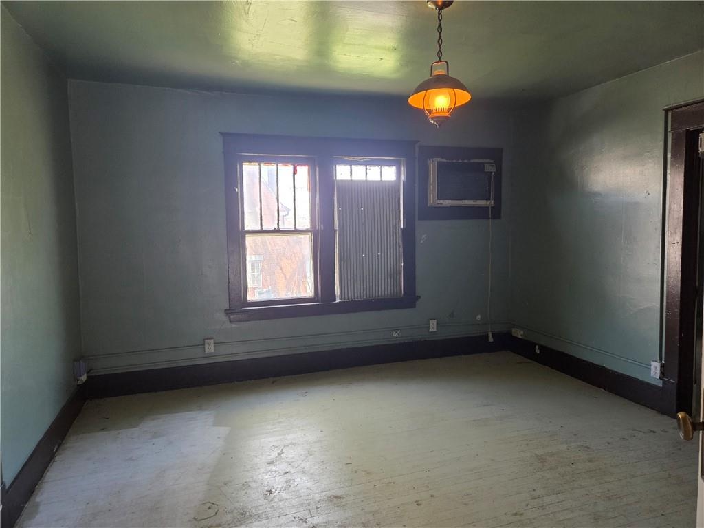 Room featuring a window with dark wood trim, a built-in air conditioning unit, and a suspended ceiling light fixture