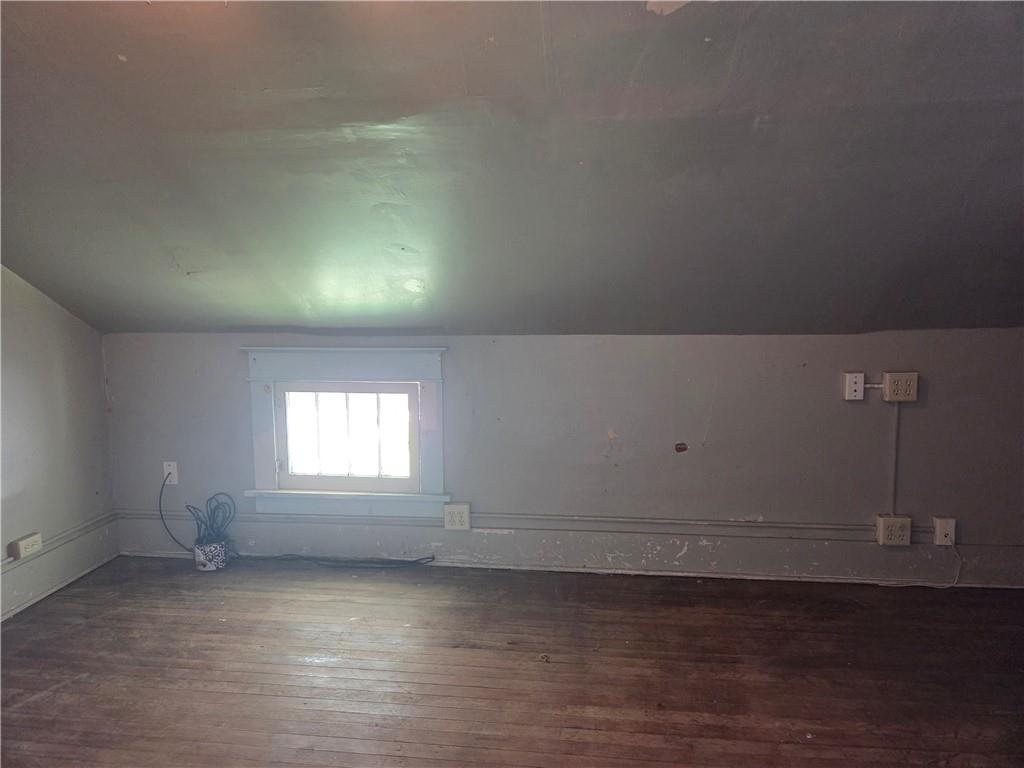 Room featuring sloped ceilings, a built-in wood-finish closet with hanging rod, and wood-finish flooring