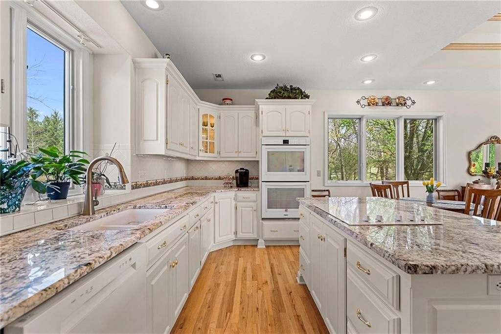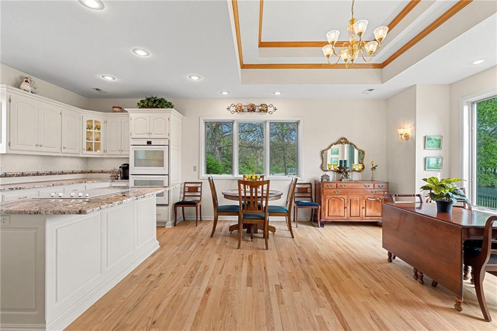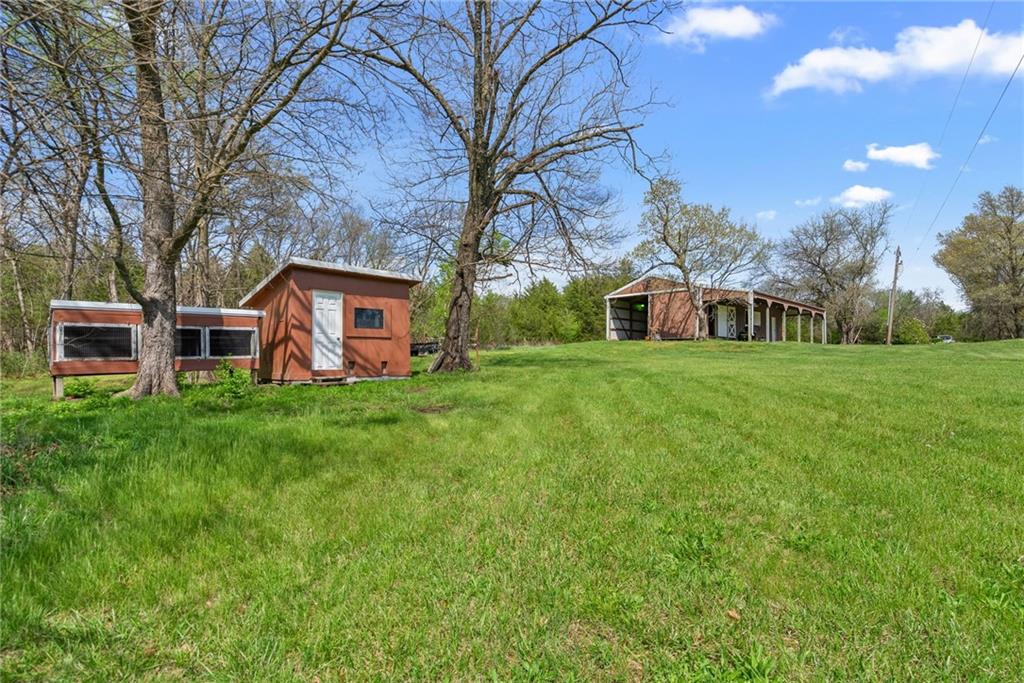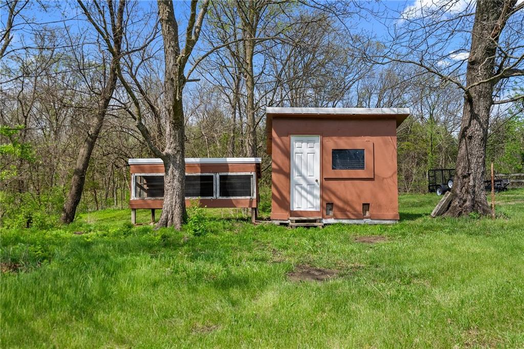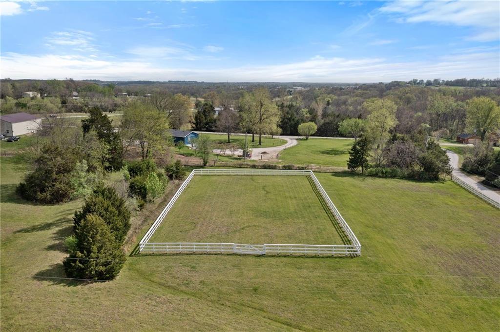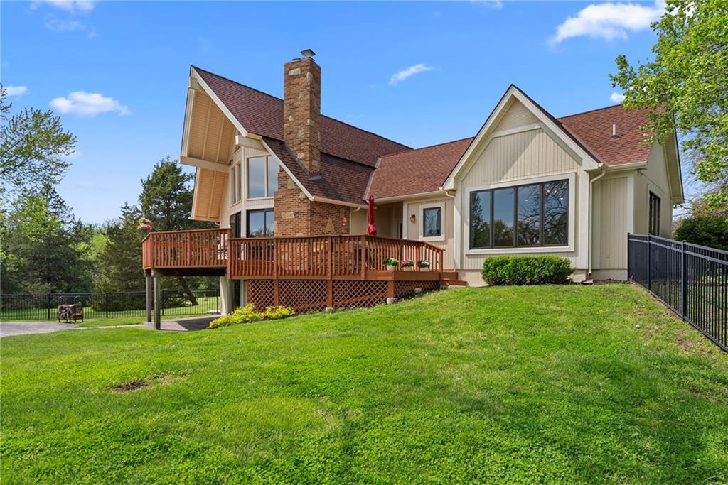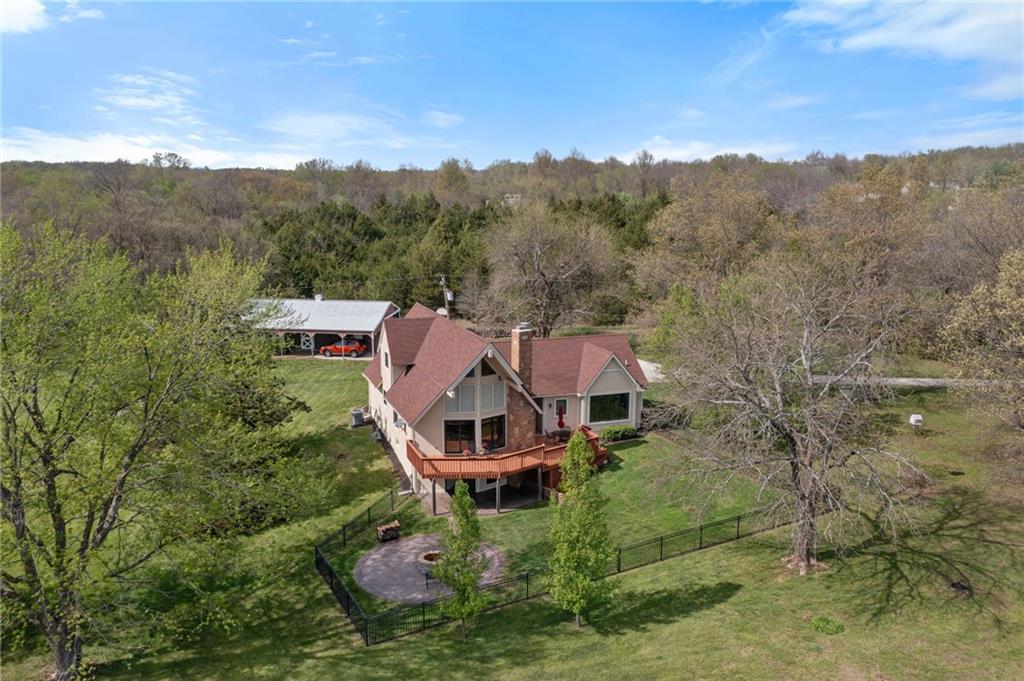 Discover a true private retreat in this one-of-a-kind A-frame estate, tucked away in a private 8-acre park-like setting just minutes from Hillsdale Lake. Designed to honor the land, this residence harmonizes rustic soul with modern functionality, offering a level of seclusion and beauty that is impossible to replicate. The heart of the home is the soaring, light-filled A-frame living area, where floor-to-ceiling windows frame incredible views of the pond and surrounding nature. This space is anchored by a majestic fireplace featuring a recently restored lifetime-warrantied flue system. The modern kitchen addition serves as a perfect bridge between the home’s original character and today’s needs, boasting custom cabinetry, double ovens, and 2021 granite surfaces. The upper level serves as a versatile getaway, featuring a full bathroom, a large bedroom, and a private landing that functions as a unique "balcony" office or nursery space. From this vantage point, you can work or relax while taking in the same expansive views from a higher perspective. For equestrian enthusiasts and hobbyists, the property features a riding arena expertly graded for drainage, an equestrian barn with 3 tongue-in-groove horse stalls, a tack room, and a shop area with reinforced concrete floors. The estate is further enhanced by a chicken coop, an aviary, and established black raspberry bushes. This meticulously maintained home offers peace of mind with a 2021 roof, dual HVAC systems under warranty, and most windows replaced in 2020-21. Located with incredible accessibility to the KC Metro, this is a rare opportunity to own a lifestyle of total privacy and architectural character without compromise.