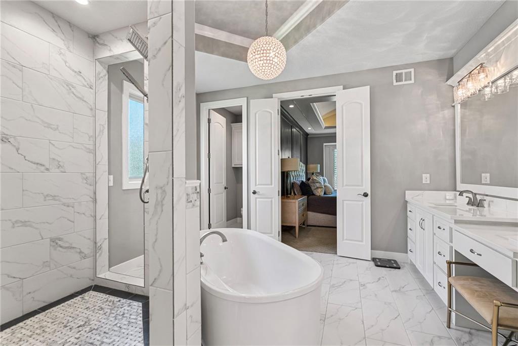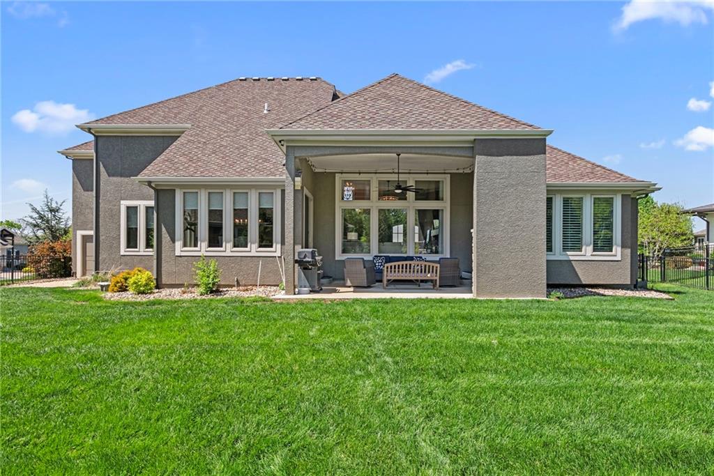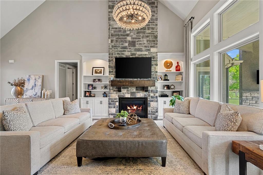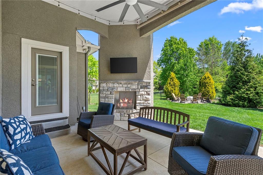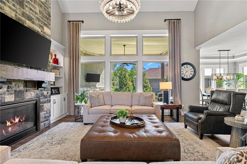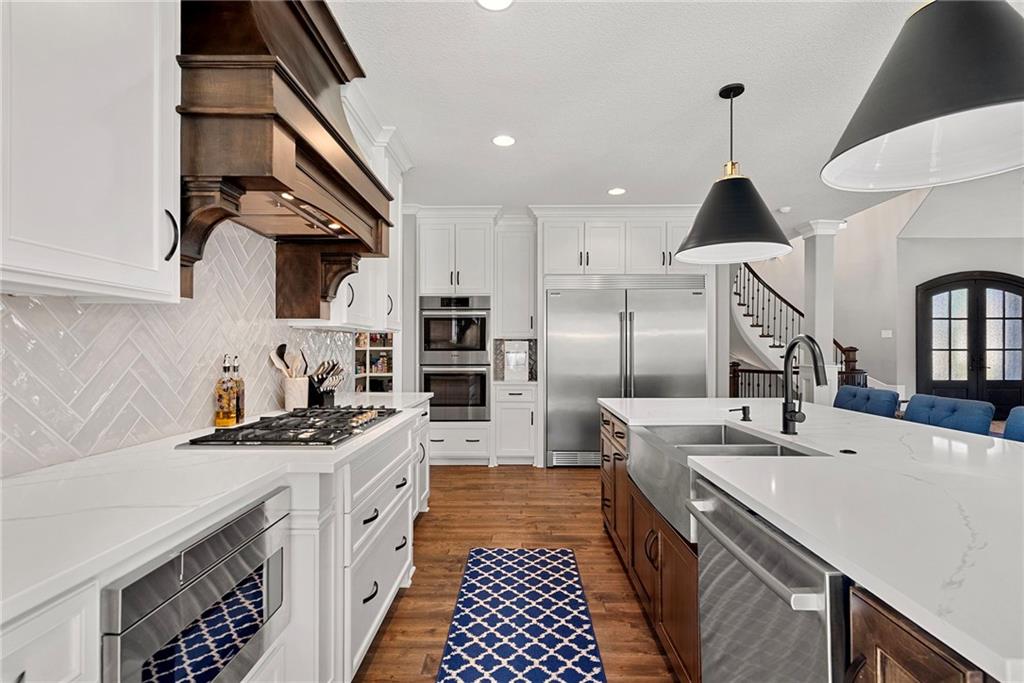 Welcome to 2604 W 162nd Terrace in Overland Park—where timeless design meets a fresh, elevated feel in the highly sought-after Blue Valley School District. Situated on a large corner lot, this stunning 1.5-story home makes an immediate impression with its beautiful stone-front exterior and oversized side-entry 3-car garage—effortless curb appeal with a polished, luxury presence. Inside, rich wood floors span the entire main level, leading you through a light-filled, open-concept layout designed for both everyday living and entertaining. The two-story living room is a showpiece—flooded with natural light and anchored by a gas fireplace flanked by custom built-ins. The kitchen truly delivers, with timeless details, featuring a large center island, Sub-Zero refrigerator, gas range, double ovens, and an expansive walk-in pantry. Just behind the kitchen, a private main-floor office is perfectly tucked away—ideal for work-from-home without sacrificing connection to the heart of the home. One of the standout moments is the stunning 2-story curved staircase—a focal point that brings a sense of elegance and flow throughout all levels. The finished lower level is built for hosting, complete with a wet bar, spacious rec room, and a cozy media area perfect for movie nights or game days. Upstairs, a loft space offers additional flexibility, while three generously sized bedrooms each feature their own private en-suite bath and walk-in closet—providing comfort, privacy, and functionality for everyone. Step outside to a fully fenced backyard designed for year-round enjoyment. The covered patio with fireplace creates the perfect setting to unwind or entertain, with plenty of space and seating area for those perfect Kansas evenings. This home seamlessly blends luxury, function, and style—delivering the elevated lifestyle today’s buyers are looking for in one of Overland Park’s most desirable locations.