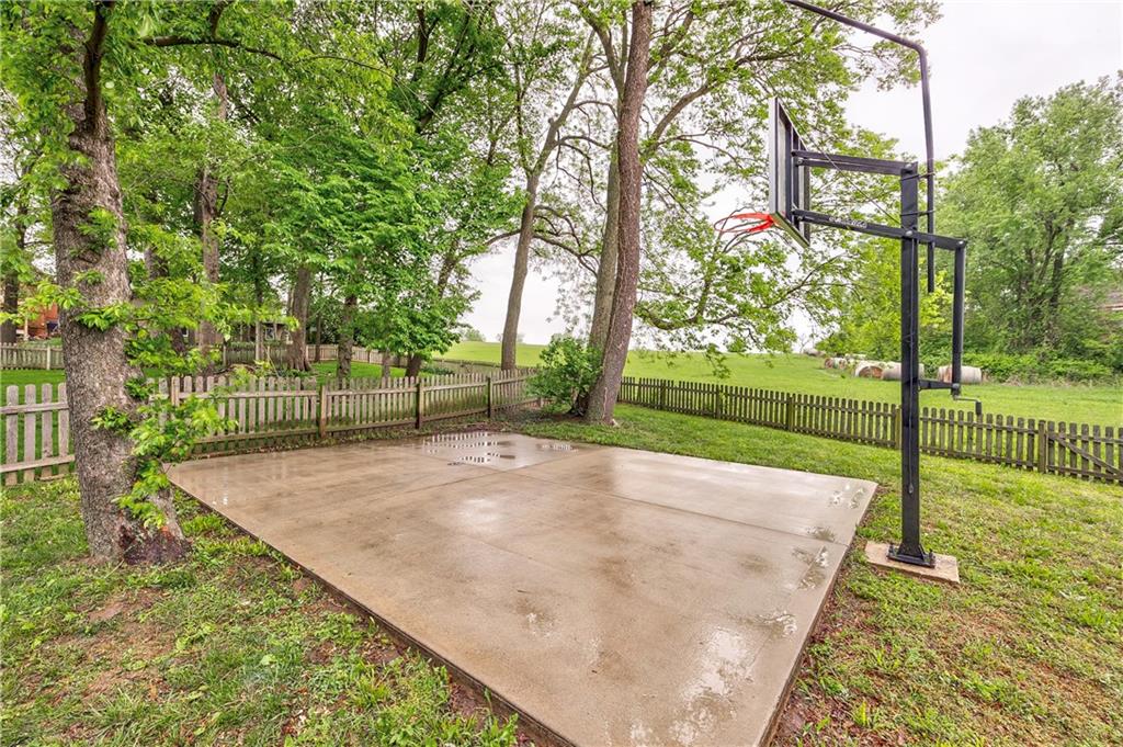 Spacious concrete patio featuring a basketball goal with backboard and rim
