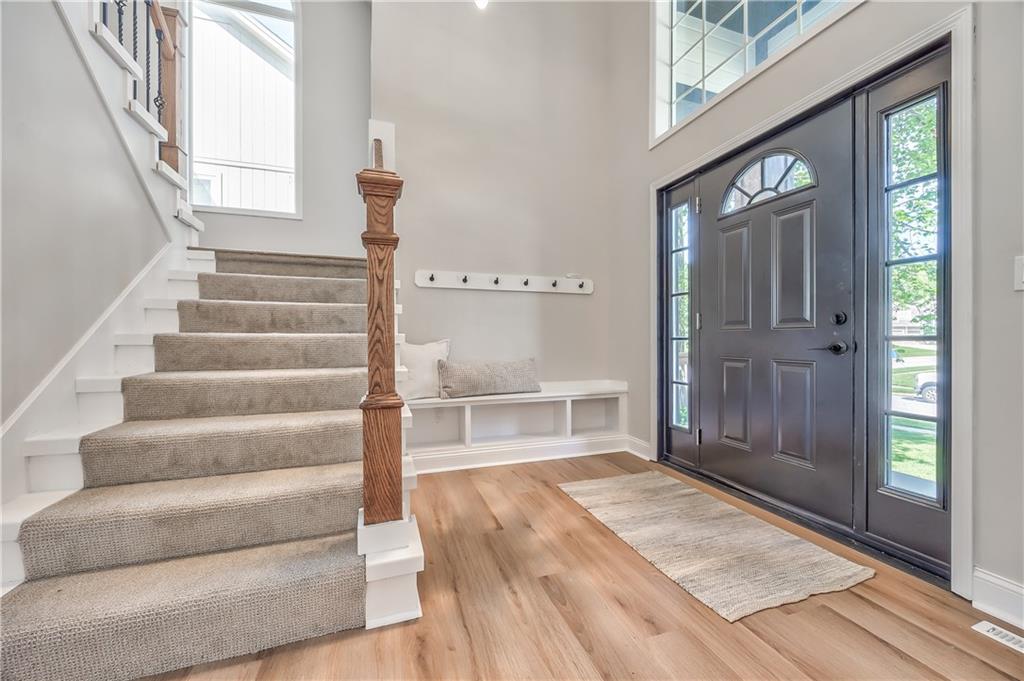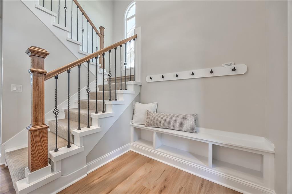 Staircase featuring wrought iron balusters and a wood-finish handrail, complemented by a built-in bench with integrated shelving