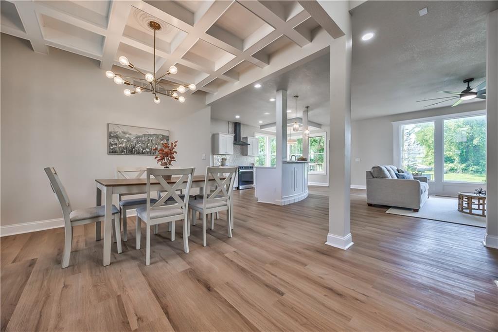 Dining area featuring wood-finish flooring, a coffered ceiling, a contemporary chandelier, and large pane windows