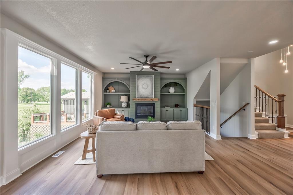 Open-concept living space featuring wood-finish flooring, a wall of large windows, a built-in fireplace with shelving, and a prominent staircase with wrought iron balusters