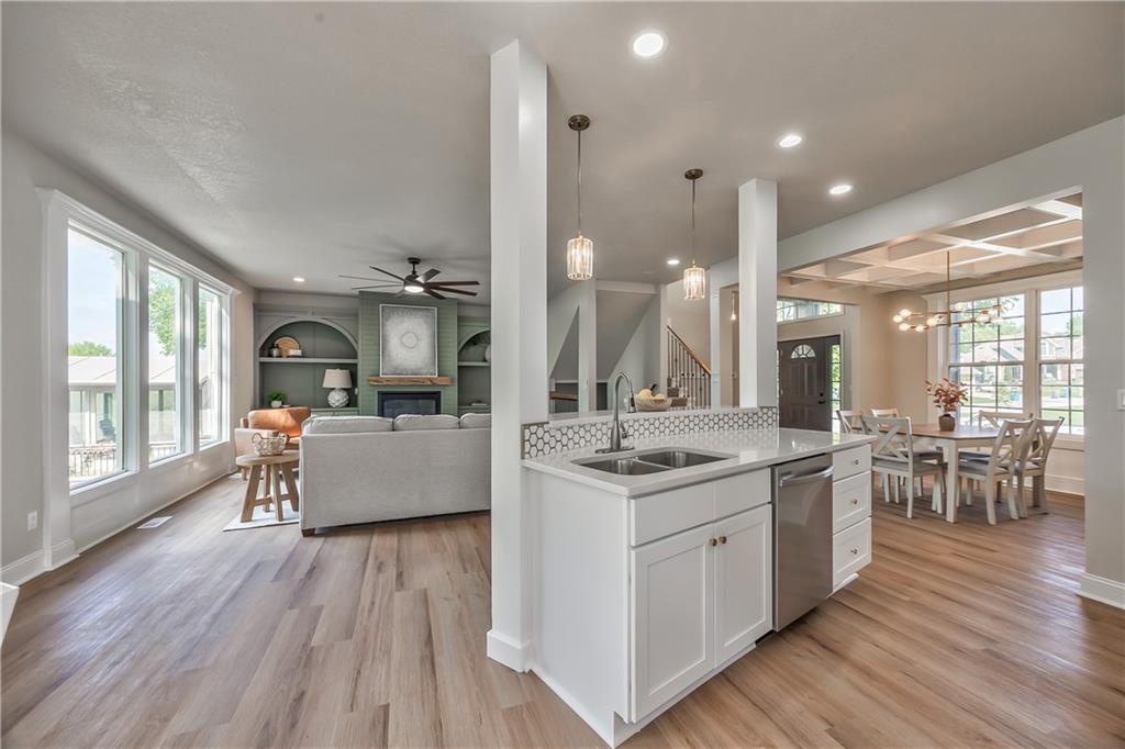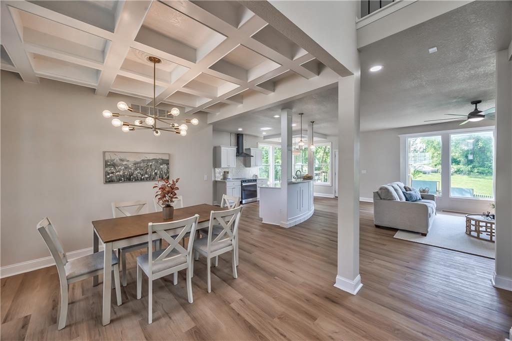 Open-concept interior featuring wood-finish flooring, a coffered ceiling, a contemporary chandelier, a kitchen island with pendant lighting, and large windows