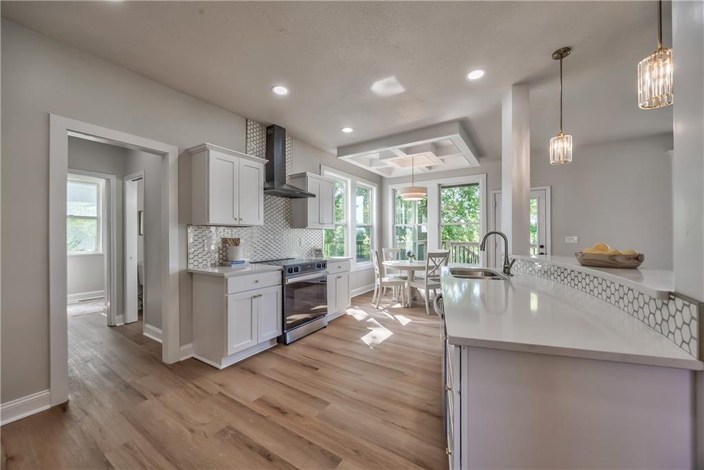 Open-concept kitchen and dining area featuring wood-finish flooring, white cabinetry, a hexagonal tile backsplash, and stainless steel appliances