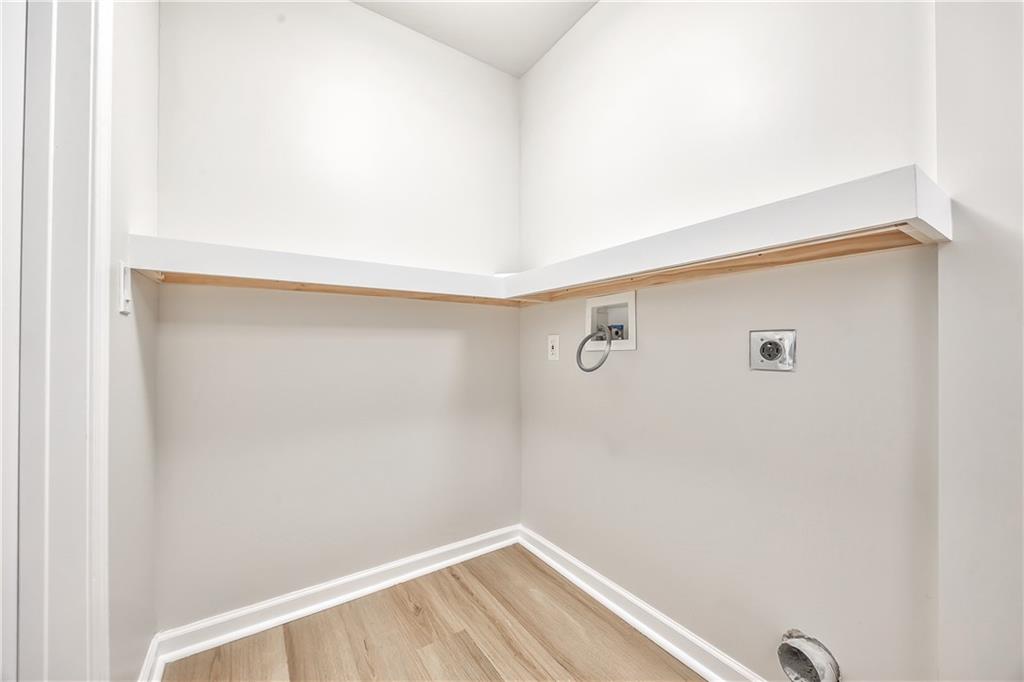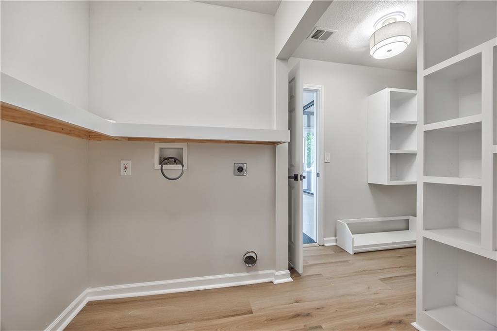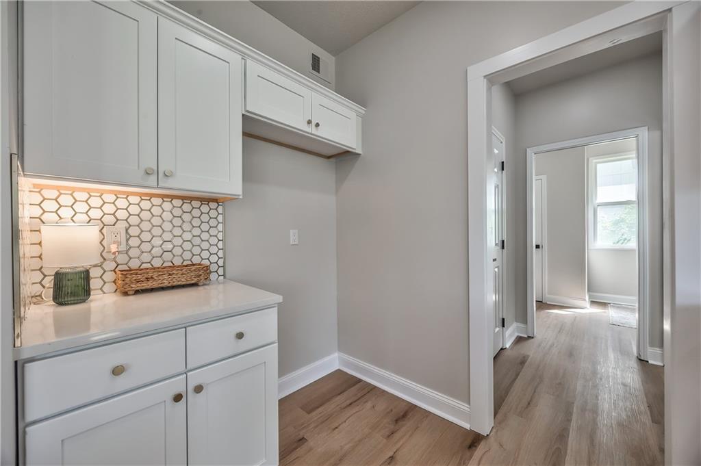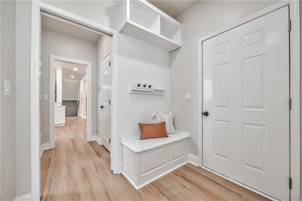 Laundry area featuring light wood-finish flooring, white built-in shelving, a built-in bench, and a wall-mounted cabinet