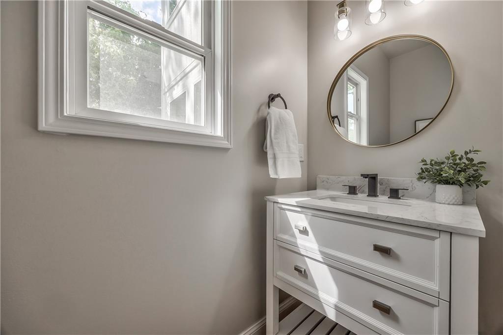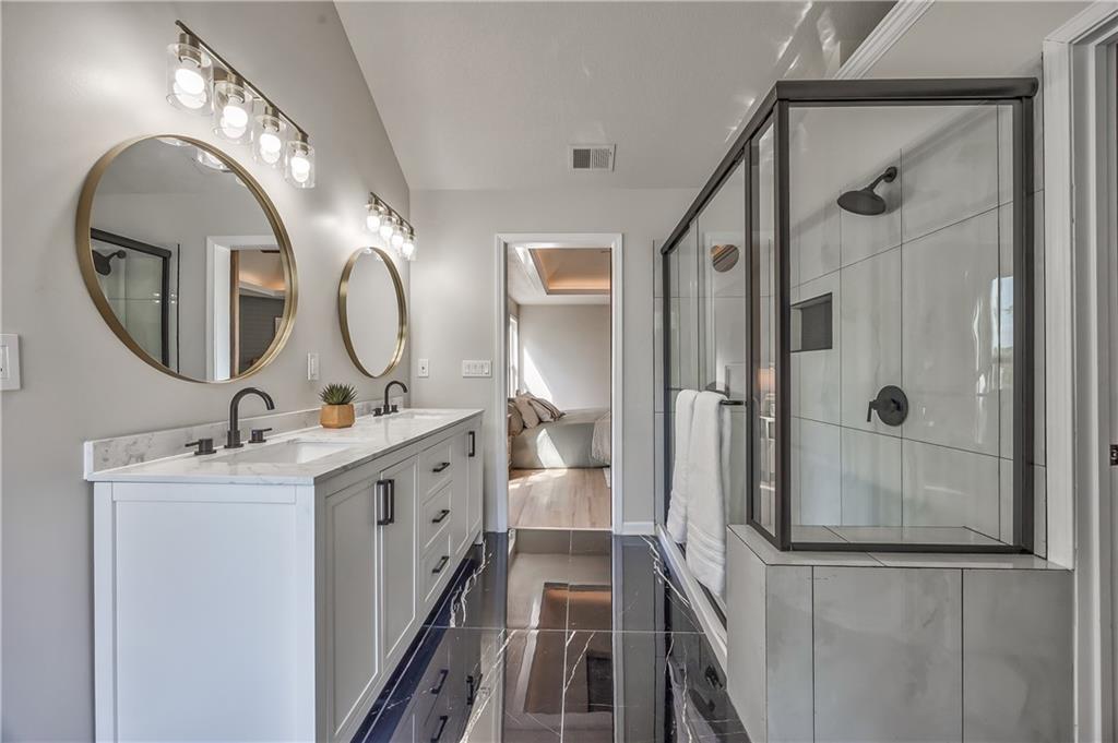 Dual vanity with quartz countertop, black fixtures, and round gold-framed mirrors