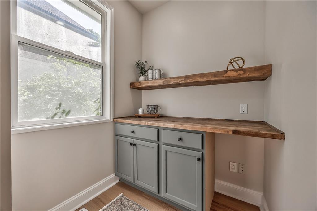Built-in cabinetry with a wood-finish countertop, coordinating floating shelf, and natural light from the window