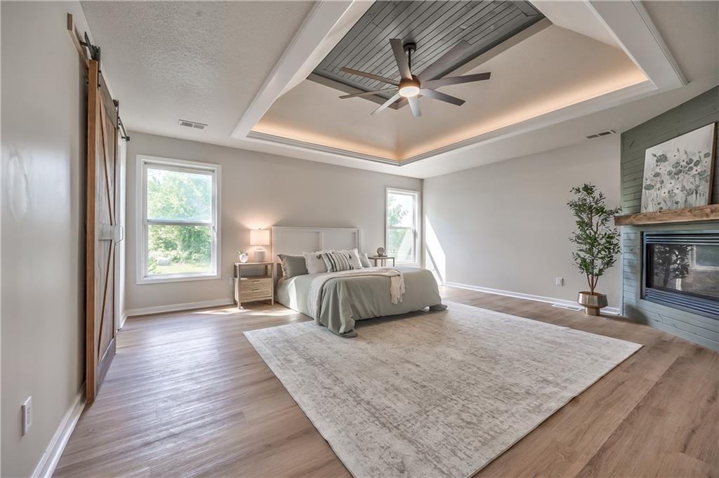 Bedroom featuring a multi-layered tray ceiling with recessed lighting, wood-finish flooring, and two large windows