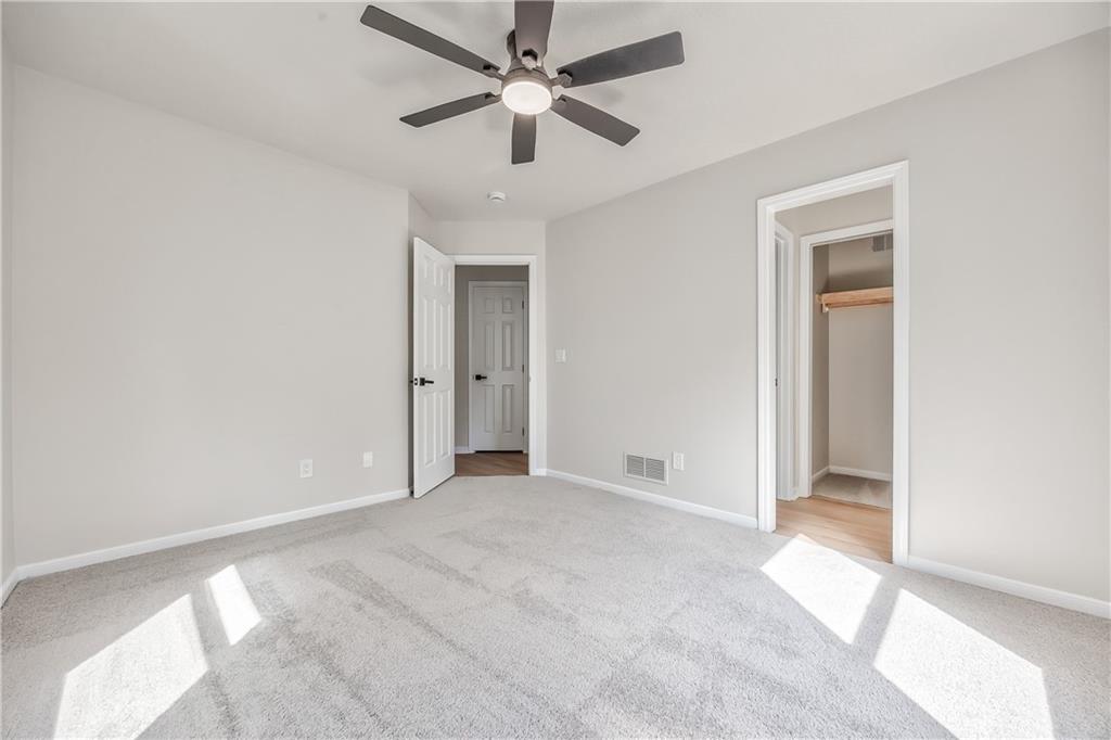 Carpeted room featuring a ceiling fan with integrated lighting, two windows with white trim, and light-colored wall paint
