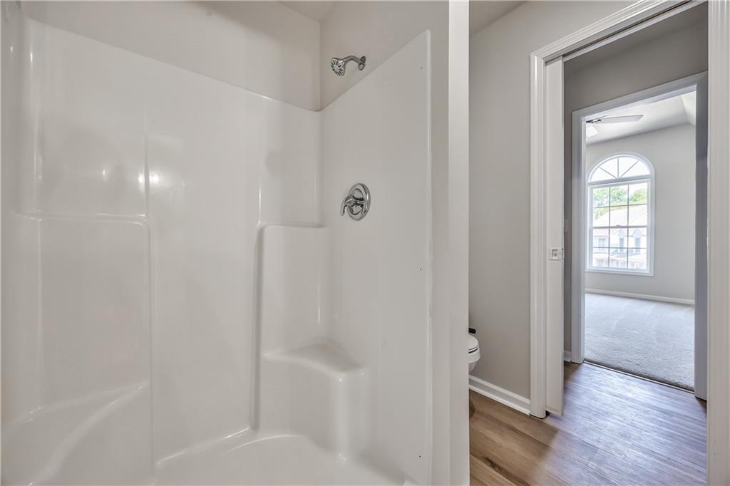 White shower stall featuring an integrated seat and chrome fixtures