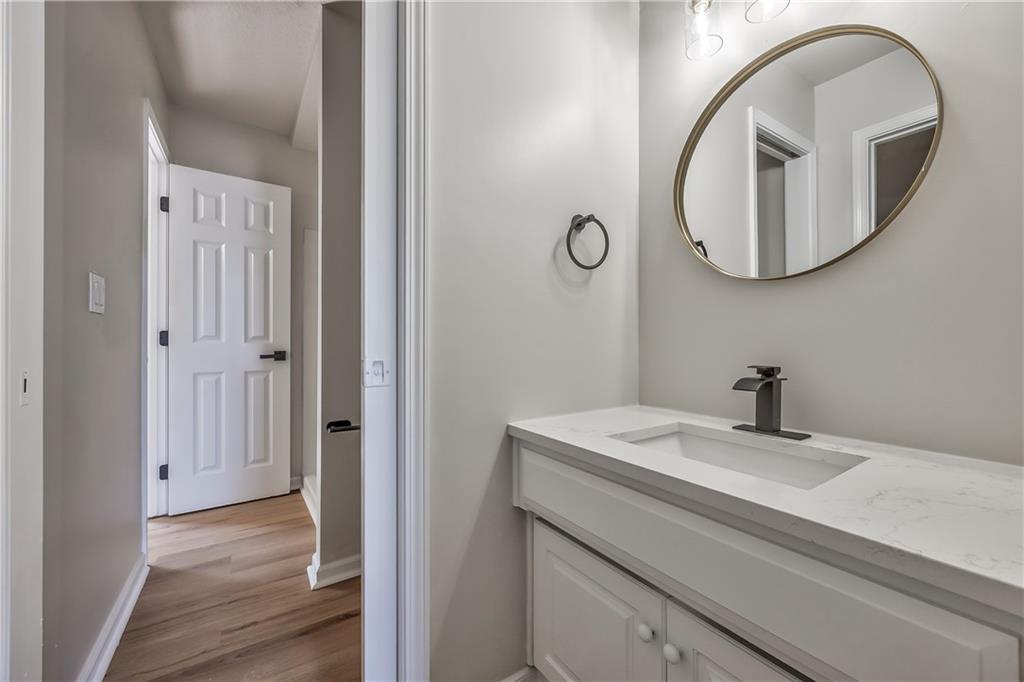 Bathroom featuring a white vanity with a white countertop, an undermount sink, and matte black hardware