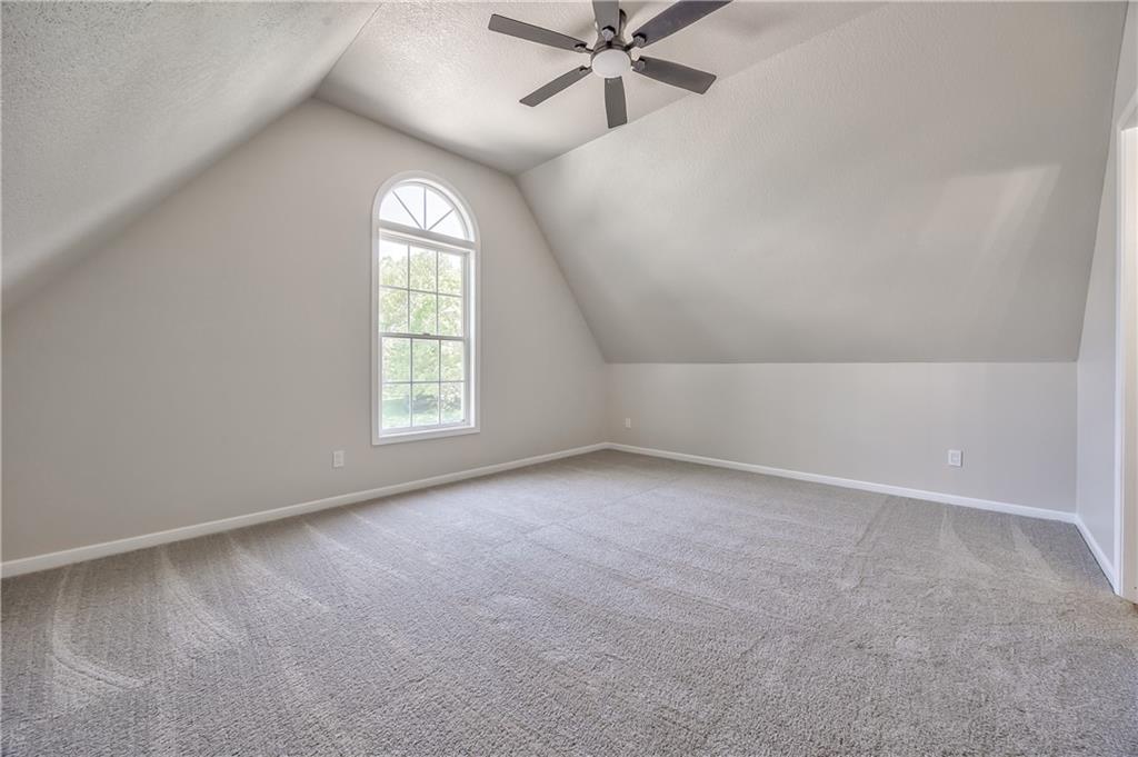 Spacious room featuring vaulted ceilings, light gray carpet flooring, and a contemporary ceiling fan with dark blades