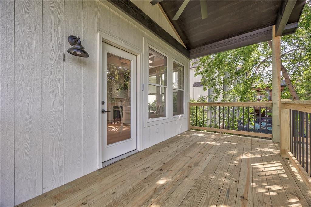 Covered outdoor deck with natural wood flooring and a black railing system
