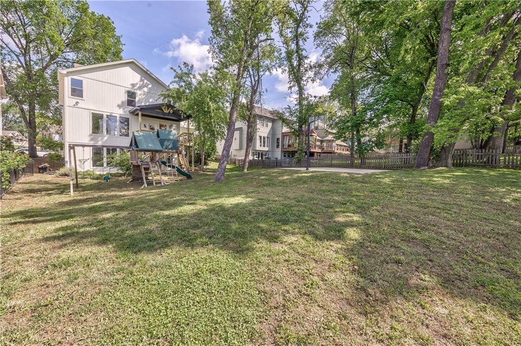 Expansive grassy backyard featuring mature trees, a playset with swings and a slide, a two-story back deck, a concrete patio, and a black metal fence bordering a water feature
